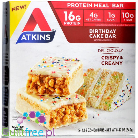 Additional information: Atkins Meal Birthday Cake - a low-carb, sugar-free cake-flavored bar with cream filling and icing sprinkles, contains sweeteners