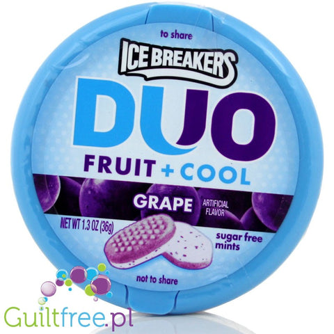 Additional information: Ice Breakers Duo Grape sugar-free mints with cooling crystals - powdered grape-mint candies with reduced calories*, sugar-free, contain sweeteners *Per 100g of product they contain on average 30% less kcal than sugar-sweetened ice breakers