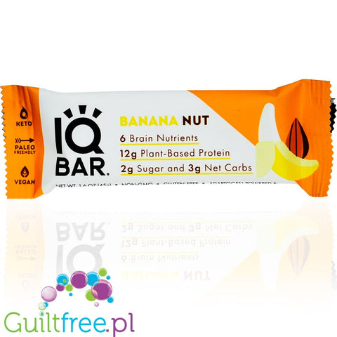 Additional information: IQ Bar Banana Nut Brain & Body plant protein bar with Lion's Mane, MCTs, Omega-3, flavonoids, vitamin E and choline - low-carb bar with bananas and almonds, contains sweeteners