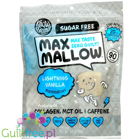 Additional information: Know Brainer Foods Max Mallow Sugar Free Marshmallows, Lightning Vanilla - sugar-free vanilla-flavored marshmallows with added MCT oil, caffeine and collagen peptides, contain sweeteners