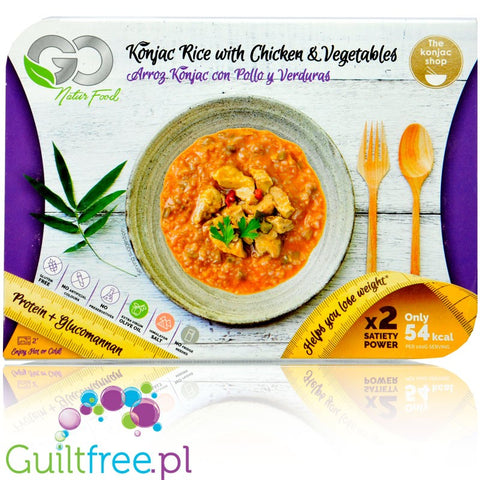 Konjac Shop Rice, Chicken & Vegetables is a complete, filling, very low-calorie dinner dish based on rice-shaped shirataki pasta, with chicken and vegetables in a well-seasoned sauce. The dish is complete, it only needs heating. The package contains one serving that provides 135kcal and 20g of protein.