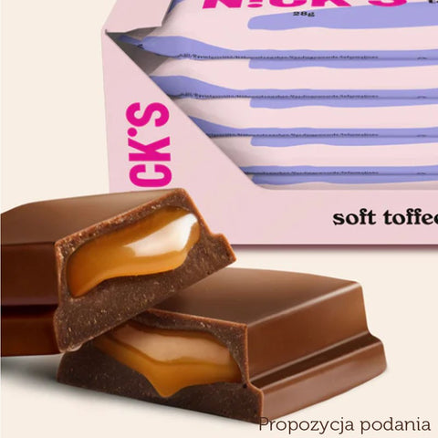 Reminding Pawełek's N!CK'S Nick's Soft Toffee chocolate bar - it's naturally sweetened with stevia and erythritol, no added sugar, no palm oil, a delicious milk chocolate bar filled with chewy caramel - a shamelessly delicious sweet chocolate bar has only 110kcal, less than 2g of sugar and almost 20% satiating fiber!