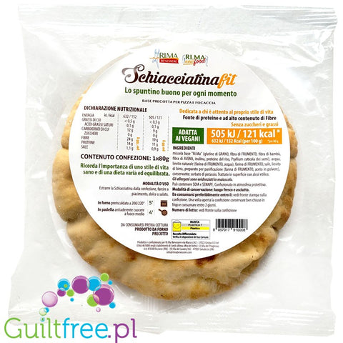 Additional information: Rima Schiacciatina Fit - a low-carb pita bread enriched with protein and fiber Packaged in a protective atmosphere. Surface treated with ethyl alcohol.