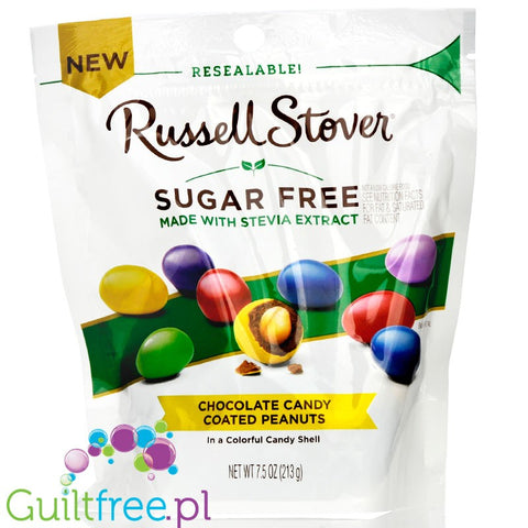 Russel Stover Chocolate Candy Coated Peanuts embedded in chocolate frosting do not contain a gram of sugar and are just as delicious, just as milk-nut-chocolate and have the same crunchy shell as their high-sugar counterpart