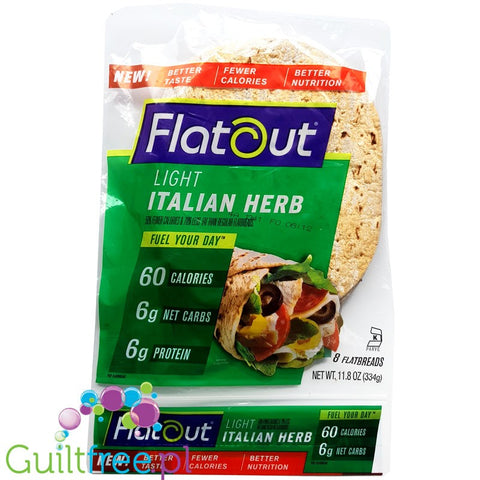 Flatout Multigrain Italian Herb is high-fiber, protein-rich and low-carbohydrate, soft, low-calorie wraps with the addition of Italian herbs. Flatout bread wraps are wraps with reduced carbohydrate content and high protein and fiber content for athletes and people on a diet.