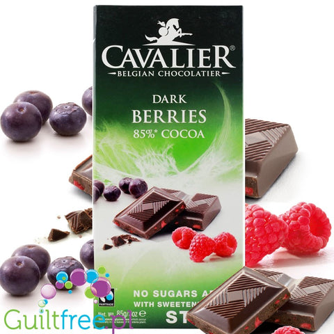 Cavalier Stevia Dark Chocolate Berries to oryginalna belgijska ciemna czekolada słodzona wyłącznie roślinnymi słodzikami: stewią i erytrytolem, bez dodatku cukru i bez maltitolu o wysokiej zawartości kakao 80% z dodatkiem aromatycznych owoców leśnych